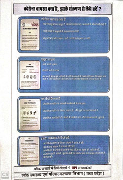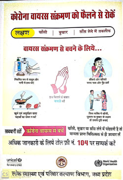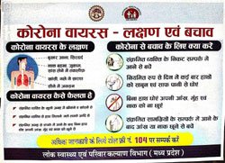 कोरोना वायरस से बचाव के लिये व्यापक प्रचार-प्रसार किया जा रहा है। सभी स्वास्थ्य केन्द्रों पर इसके संबंध में सूचनाएँ प्रदर्शित की गयी हैं और अस्पतालों में सर्दी, खांसी, और बुखार के मरीजों का अलग से परीक्षण शुरू किया गया है। यदि किसी मरीज की या उससे संबंधित सम्पर्क वाले व्यक्ति की ट्रेवल हिस्ट्री है, तो उसे निगरानी में रखा जा रहा है। इन सभी मरीजों के साथ सभी लोगों को बताया भी जा रहा है कि भारतीय संस्कारों के साथ अभिवादन करें, हाथ न मिलाएं। नमस्ते आदाब की संस्कृति को अपनायें, खांसते-छीकतें समय मुँह पर कपड़ा रखें और कोहनी से नाक, मुँह ढकें। सर्दी-खांसी से संक्रमित व्यक्ति से दूरी बनायें। सार्वजनिक स्थलों पर जाने से बचें और 30 सेकण्ड तक साबुन से हाथ धोयें।