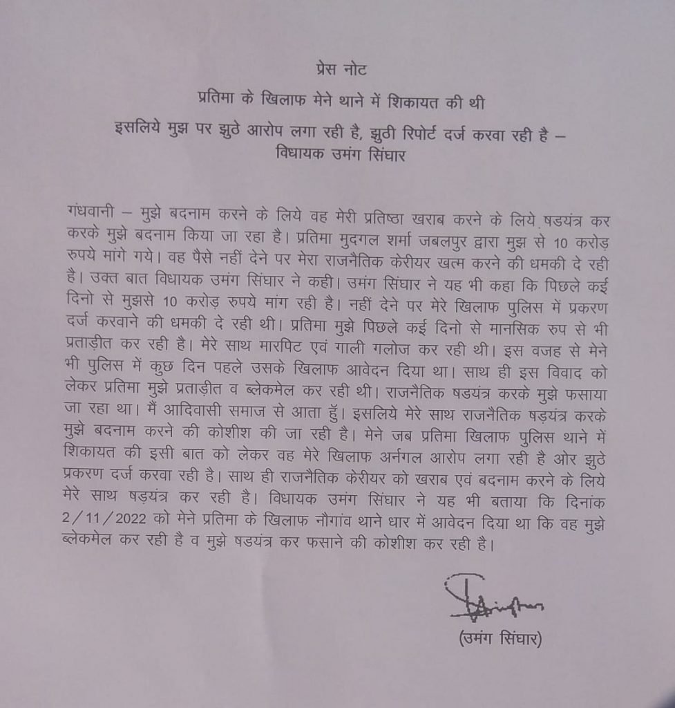 पीड़ित महिला ने खुद को उमंग सिंघार की पत्नी बताते हुए धार जिले के पुलिस थाना नौगांव में रिपोर्ट दर्ज कराई है कि पीडब्ल्यूडी कार्यालय के पीछे विधायक निवास में उमंग सिंगार ने नवंबर 2021 से लेकर 18 नवंबर 2022 के बीच दुष्कर्म किया। महिला ने अपनी शिकायत में विधायक पर अप्राकृतिक कृत्य करने का भी आरोप लगाया है। बता दें कि पूर्व मंत्री और आदिवासी विधायक उमंग सिंघार के खिलाफ एफआईआर कराने वाली महिला भी कांग्रेस की पदाधिकारी बताई जा रही है। दिलचस्प पहलू यह भी है कि उमंग सिंघार के खिलाफ तब मामला दर्ज हुआ जब भारत जोड़ो यात्रा के तहत राहुल गांधी की यात्रा बुरहानपुर आ रही है। इसके पहले 2 नवंबर को विधायक उमंग सिंघार ने भी नौगांव थाने में लिखित शिकायत कर पत्नी के खिलाफ 10 करोड़ रुपया मांगने और ब्लैकमेल करने का आरोप लगाया है। विधायक उमंग सिंघार ने भी शिकायतकर्ता महिला को अपनी पत्नी बताया है। एफआईआर के बाद सिंघार ने एक बयान जारी कर बताया है कि उन्होंने 2 नवंबर 2022 को अपनी दूसरी पत्नी के खिलाफ थाने में लिखित शिकायत की थी। उन्होंने कहा कि 16 अप्रैल 2022 को उन्होंने महिला से विवाह किया था। विवाह करने के बाद से ही वह ब्लैकमेल करने लगी। सिंघार ने अपनी शिकायत में यह भी उल्लेख किया है कि पत्नी ने मुझसे 10 करोड़ मांगे नहीं देने पर राजनीतिक कैरियर समाप्त करने की धमकी भी दी। इस पूरे मामले पर विधायक उमंग सिंघार का कहना है कि मुझे बदनाम करने और वह मेरी प्रतिष्ठा खराब करने के लिए षड्यंत्र किया जा रहा है।