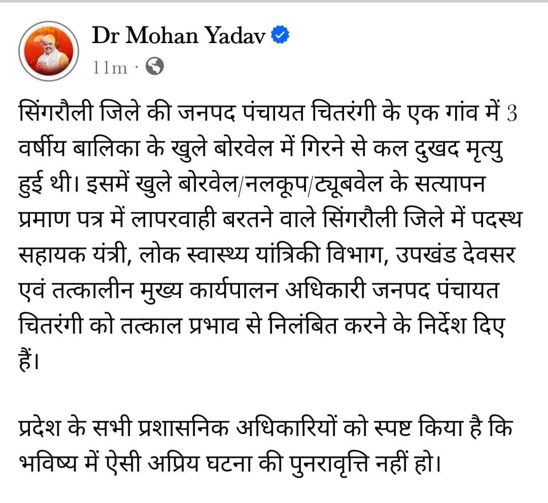 बोरवेल में गिरकर जान गंवाने वाली मासूम सौम्या के मामले में मुख्यमंत्री ने कई अधिकारयों को किया निलंबित