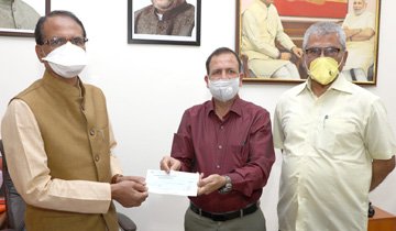 मुख्यमंत्री श्री शिवराज सिंह चौहान को कोरोना सहायतार्थ मुख्यमंत्री सहायता कोष के लिए पत्रकार श्री राजेन्द्र आगल ने एक लाख रुपए का चैक भेंट किया । इस अवसर पर वरिष्ठ पत्रकार श्री मृगेन्द्र सिंह मौजूद थे।