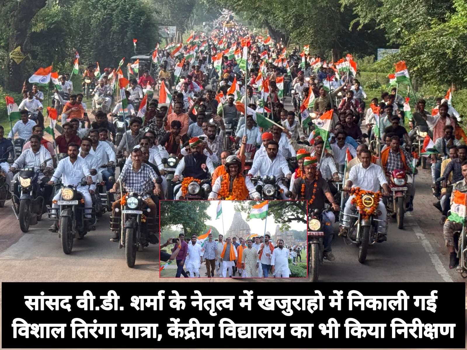 इस अवसर पर नगर परिषद खजुराहो के अध्यक्ष अरुण कुमार अवस्थी, राजनगर के अध्यक्ष जितेंद्र वर्मा, और लवकुशनगर के अध्यक्ष जीतू खटीक सहित कई अन्य जनप्रतिनिधि भी मौजूद थे।केंद्रीय विद्यालय का निरीक्षण और पौधरोपणतिरंगा यात्रा के बाद, सांसद वी.डी. शर्मा ने केंद्रीय विद्यालय का भी निरीक्षण किया। उन्होंने ‘एक पेड़ मां के नाम’ अभियान के तहत पौधरोपण किया और बच्चों से सीधे संवाद किया। उन्होंने छात्रों से अपील की कि वे अपने जन्मदिन पर एक पौधा लगाएं।सांसद ने विद्यालय के प्राचार्य को निर्देश दिए कि बच्चों की रुचि के अनुसार खेलकूद और सांस्कृतिक गतिविधियों का भी आयोजन किया जाए। उन्होंने विद्यालय में आवश्यक सुविधाओं को सुनिश्चित करने का भी आश्वासन दिया।