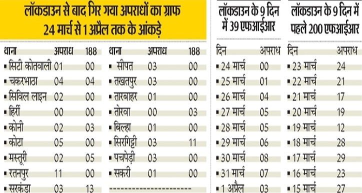 जिले में 8 दिन में कोई बड़ी वारदात नहीं हुई। लूट व डकैती जैसे जघन्य अपराध तो जीरो हो गए। लाॅक डाउन के बाद प्राइवेट वाहनों पर भी रोक है। इसके चलते एक्सीडेंट की घटनाएं नहीं हो रही। बिलासपुर में 15 दिन पहले तखतपुर में महिला की हत्या हुई थी। 8 दिन में कोई बड़ी वारदात नहीं हुई। हिर्री व तोरवा में एक भी अपराध नहीं लाॅकडाउन के दौरान हिर्री व तोरवा क्षेत्र में एक भी अपराधिक घटनाएं नहीं हुई है। सबसे अधिक 11 घटनाएं रतनपुर थाना क्षेत्र में हुई।