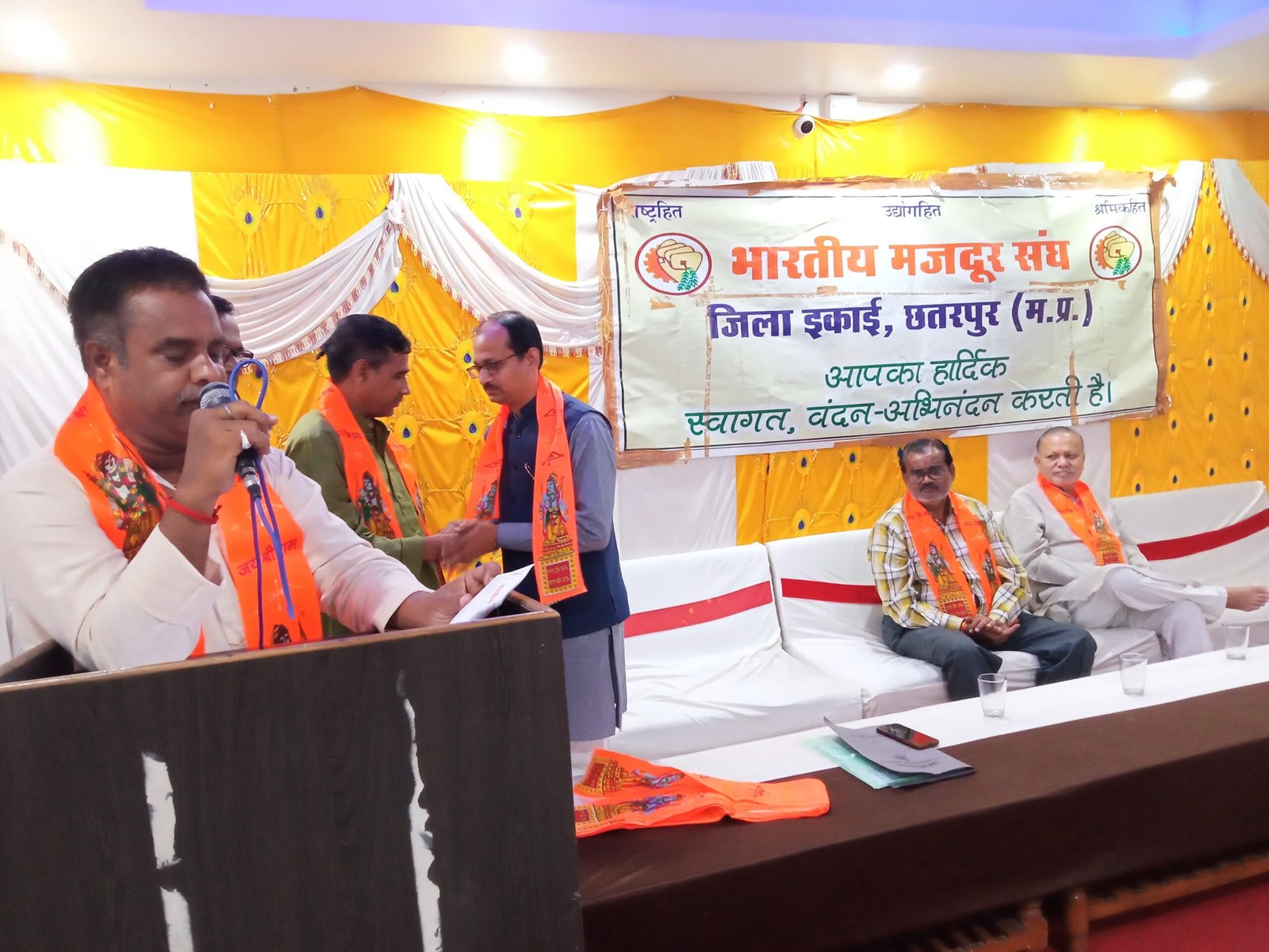 छतरपुर-भारतीय मजदूर संघ जिला इकाई छतरपुर के जिला सम्मेलन में नवीन जिला कार्यकारिणी का हुआ गठन किया गया, भारतीय मजदूर संघ व सम्बध्द संगठनों के पदाधिकारी व कार्यकर्ता जिला सम्मेलन में शामिल हुए,कार्यक्रम में मुख्य अतिथि हरेन्द्र सिंह चंदेल प्रदेश उपाध्यक्ष बीएमएस,विशिष्ट अतिथि नारायण काले वरिष्ठ नागरिक परिसंघ,देवेन्द्र हिंगवासिया प्रदेश उपाध्यक्ष राज्य कर्मचारी संघ,अशोक पटैरिया विभाग प्रमुख बीएमएस एवं डॉ एस एन पाठक कार्यक्रम अध्यक्ष रहे,जिला सम्मेलन की शुरुआत विनोद सैनी के संचालन में अतिथियों व्दारा भगवान श्री विश्वकर्मा, भारत माता एवं श्रध्येय दत्तोपन्त ठेगड़ी जी के चित्र पर फूलमाला व दीप प्रज्ज्वलित कर की गई,इसके बाद संघ गीत का गायन होने बाद मंचासीन अतिथियों का स्वागत सम्मान किया गया,कार्यक्रम अध्यक्ष डॉ एस एन पाठक व्दारा पिछले तीन बर्षो से कार्यरत जिला कार्यकारिणी को भंग करने की घोषणा की गई,उसके बाद कार्यक्रम के मुख्य अतिथि हरेन्द्र सिंह चंदेल ने संगठन के कार्यों की समीक्षा व पदाधिकारीयों/कार्यकर्ताओं के दायित्व निर्वाहन पर प्रकाश डालते हुए उनके व्दारा भारतीय मजदूर संघ की नवीन जिला कार्यकारिणी की घोषणा की गई,जिसमें भूपेंद्र सिंह बुन्देला को जिलाध्यक्ष,वीरेन्द्र सिंगोटे,अनिल सेन,अर्चना साहू जिला उपाध्यक्ष,श्रीकांत मिश्रा जिला मंत्री,धन्वंतरि शर्मा,राजेन्द्र चौरसिया, विनोद तिवारी सह मंत्री,दिव्या सक्सेना कोषाध्यक्ष,अरविंद गौतम कार्यालय मंत्री एवं वशिष्ठ नारायण श्री वास्तव,अजय सिंह पायक बिधि सलाहकार नियुक्त किये गये,संघ के वरिष्ठ पदाधिकारीयों ने कहा कि सभी नव नियुक्त पदाधिकारीयों से आशा है कि आप संगठन की मंशानुसार संघ विस्तार व कार्यो को गति प्रदान करें और सभी को बधाई एवं शुभकामनाएं दीं|कार्यक्रम के दौरान विनोद सैनी अध्यक्ष बिजली कर्मचारी महासंघ पूर्व क्षेत्र कम्पनी,सुनील अवस्थी अध्यक्ष,अरविंद हिन्दुओ संयोजक वरिष्ठ नागरिक परिसंघ,नरेन्द्र निगम संगठन मंत्री,रामकुमार गुप्ता सचिव पेंशन कर्मचारी संघ,जी डी सोनकिया जिला अध्यक्ष राज्य कर्मचारी संघ,हीरा देवी चंदेल प्रदेश उपाध्यक्ष आशा कार्यकर्ता संघ,मीटर रीडर संघ से हरगोबिन्द व्दिवेदी,प्रवेश शर्मा,सुभाष सक्सेना मौजूद रहे|