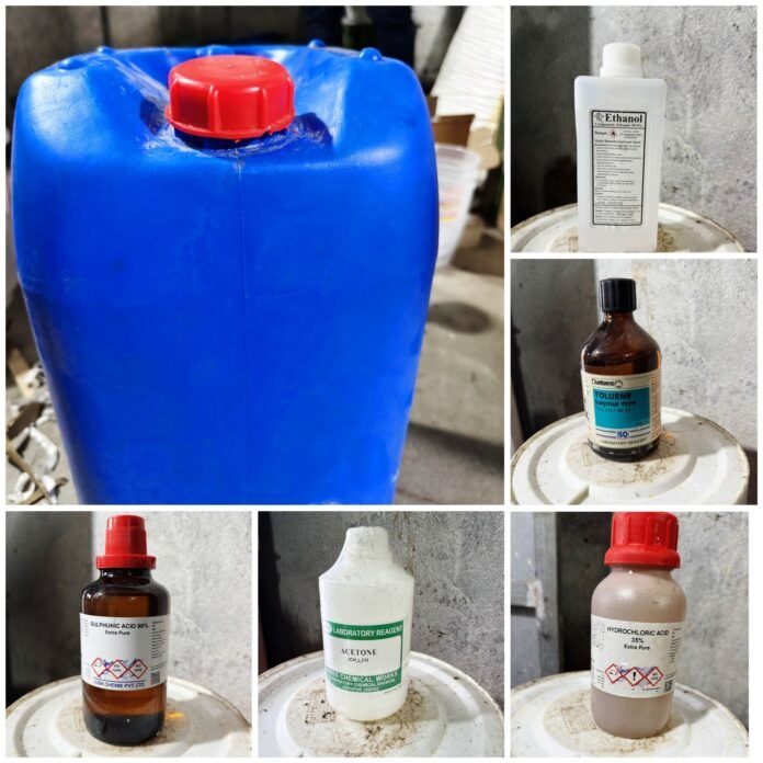 आरोपी व्यक्ति से गहन पूछताछ में पता चला कि अवैध दवा एमडीएमए पाउडर के निर्माण के लिए आवश्यक अन्य आवश्यक रसायन पास के खेत में गड़े हुए थे। जिसका वीडियो भी सामने आया है, जिसकी खुदाई की गई, जिससे उन आवश्यक रसायनों की बरामदगी हुई। गुप्त प्रयोगशाला की तलाशी के दौरान, एसीटोन, टोल्यूनि, हाइड्रोक्लोरिक एसिड, सोडियम सल्फेट, सोडियम कार्बोनेट, सल्फ्यूरिक एसिड, ब्रोमीन वाटर, इथेनॉल आदि सहित 80.96 किलोग्राम और 7.5 लीटर रसायन बरामद किए गए और उन्हें जब्त कर लिया गया।