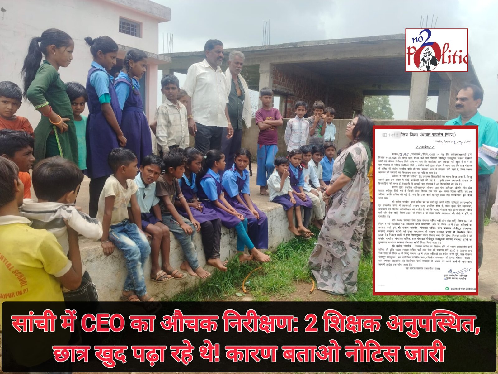 रायसेन (मध्य प्रदेश): जिला पंचायत के मुख्य कार्यपालन अधिकारी (CEO) ने आज सांची विकासखंड की प्राथमिक शाला सतकुण्डा का औचक निरीक्षण किया, जहां चौंकाने वाला मामला सामने आया। निरीक्षण के दौरान शाला के दो शिक्षक अनुपस्थित पाए गए, जबकि सभी छात्र-छात्राएं शत-प्रतिशत उपस्थित थे और शिक्षकों का इंतजार कर रहे थे।