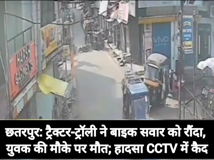 छतरपुर: शहर के कोतवाली थाना क्षेत्र में एक दर्दनाक सड़क हादसा हुआ है। गांव की देवी मंदिर के सामने एक तेज रफ्तार ट्रैक्टर-ट्रॉली ने एक बाइक सवार युवक को रौंद दिया, जिससे उसकी मौके पर ही मौत हो गई। यह पूरी घटना पास लगे सीसीटीवी कैमरे में कैद हो गई है।