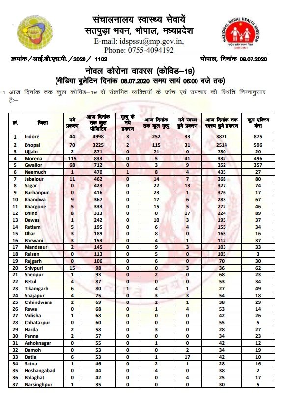 इंदौर में आज कोरोना के 44 नये मामले सामने आए. इसके साथ ही इंदौर में कोरोना संक्रमितों की संख्या बढ़कर 4998 हो गई है. इंदौर में आज कोरोना से 3 लोगों की मृत्यु हुई. इसके साथ ही इंदौर में अब तक 252 लोगों की कोरोना से मृत्यु हो गई. इंदौर और भोपाल के अतिरिक्त चंबल क्षेत्र का मुरैना जिला कोरोना संक्रमण का बड़ा केन्द्र बनकर उभरा है.आज वहां प्रदेश में आज सबसे ज्यादा 115 लोग कोरोना पाजिटिव पाए गए. इसके साथ ही मुरैना जिलों में कोरोना संक्रमितों की संख्या बढ़कर 833 हो गई. अब तक मुरैना में कोरोना से 5 लोगों की मौत हो चुकी है. बढ़ते कोरोना संक्रमण के कारण ग्वालियर संभाग के संभागीय मुख्यालय ग्वालियर में तीन दिन के लाकडाउन के बाद आज से सुबह 6 बजे से दोपहर दो बजे तक बाजार खोलने की अनुमति दी गई है.
