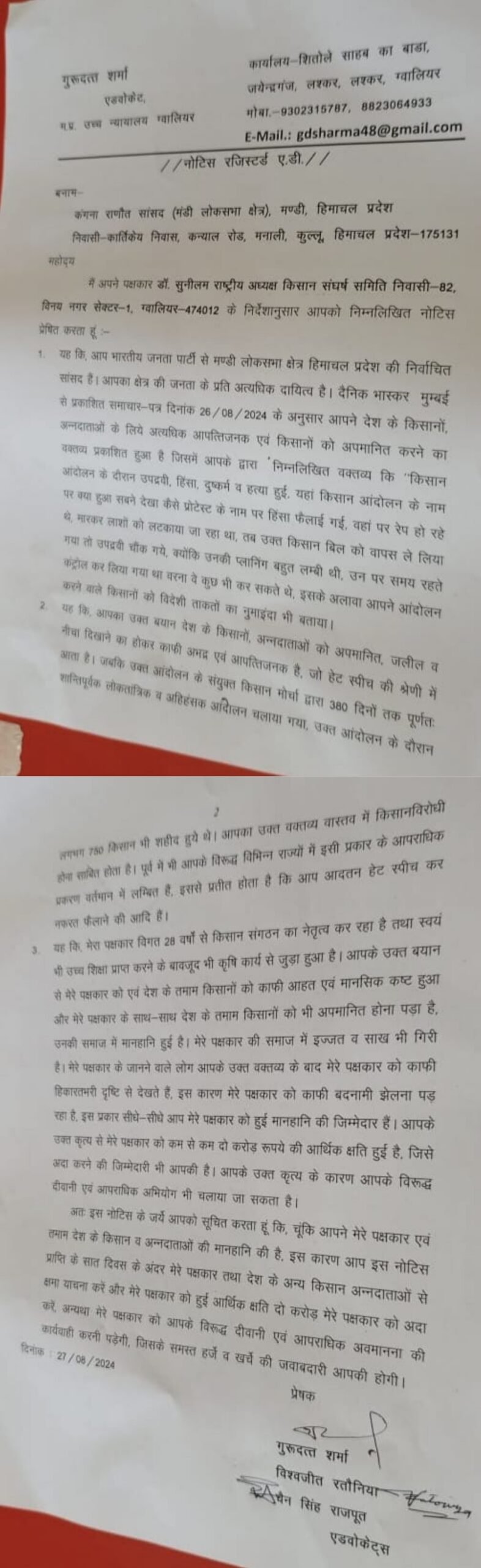 ग्वालियर,सांसद कंगना रनौत को मानहानि का नोटिस,किसानों के खिलाफ अभद्र टिप्पणी करने के मामले में दिया गया है नोटिस, किसान संघर्ष समिति के नेता विश्वजीत रतौनिया एडवोकेट ने दिया नोटिस,नोटिस के माध्यम से दी है चेतावनी, सात दिन के अंदर नहीं मांगी माफी,तो विधिक कार्रवाई को रहें तैयार,विश्वजीत रतोनिया किसान संघर्ष समिति के अलावा ओबीसी महासभा के हैं राष्ट्रीय,किसानों को लेकर कंगना रनौत की विवादित टिप्पणी के बाद गुस्से में अंचल के किसानबाइट – विश्वजीत रतोनिया एडवोकेट, नेता किसान संघर्ष समिति ग्वालियर
