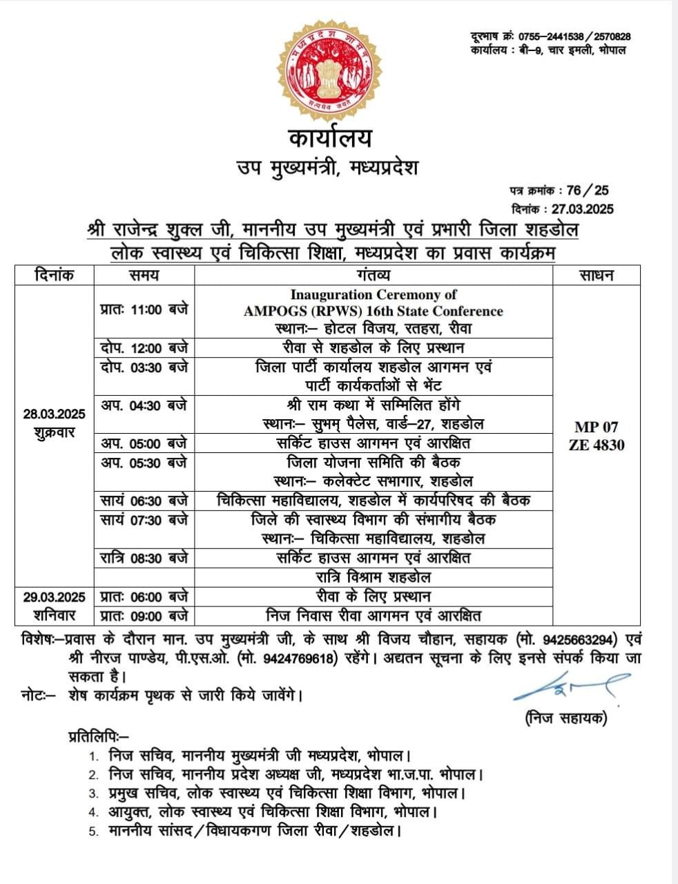 शहडोल उप मुख्यमंत्री एवं शहडोल जिले के प्रभारी मंत्री राजेंद्र शुक्ल कल शहडोल जिले के दौरे पर रहेंगे जारी कार्यक्रम के अनुसार, दोपहर 2 बजे शहडोल आगमन एवं कार्यकर्ताओ से भेंट करेंगे। 3 बजे शहडोल से धनपुरी के लिए प्रस्थान करेंगे, 3ः25 बजे धनपुरी पहुंचकर नगर पालिका द्वारा किए जा रहे विकास कार्यों का अवलोकन करेंगे तथा 4ः30 बजे शहडोल पहुंचकर वार्ड नं. 27 शहडोल के शुभम पैलेस में श्री राम कथा में सम्मिलित होगें। उप मुख्यमंत्री शुक्ल सांय 5ः30 बजे से कलेक्टर कार्यालय में जिला योजना समिति की बैठक लेंगे, सांय 6ः30 बजे चिकित्सा महाविद्यालय शहडोल में कार्य परिषद की बैठक एवं सांय 7ः30 बजे जिले की स्वास्थ्य विभाग की संभागीय बैठक लेंगे एवं रात्रि 8ः30 बजे सर्किट हाउस आगमन एवं समय आरक्षित रहेगा। उप मुख्यमंत्री राजेंद्र शुक्ल 29 मार्च को प्रातः 6 बजे शहडोल से रीवा के लिए प्रस्थान करेंगे।