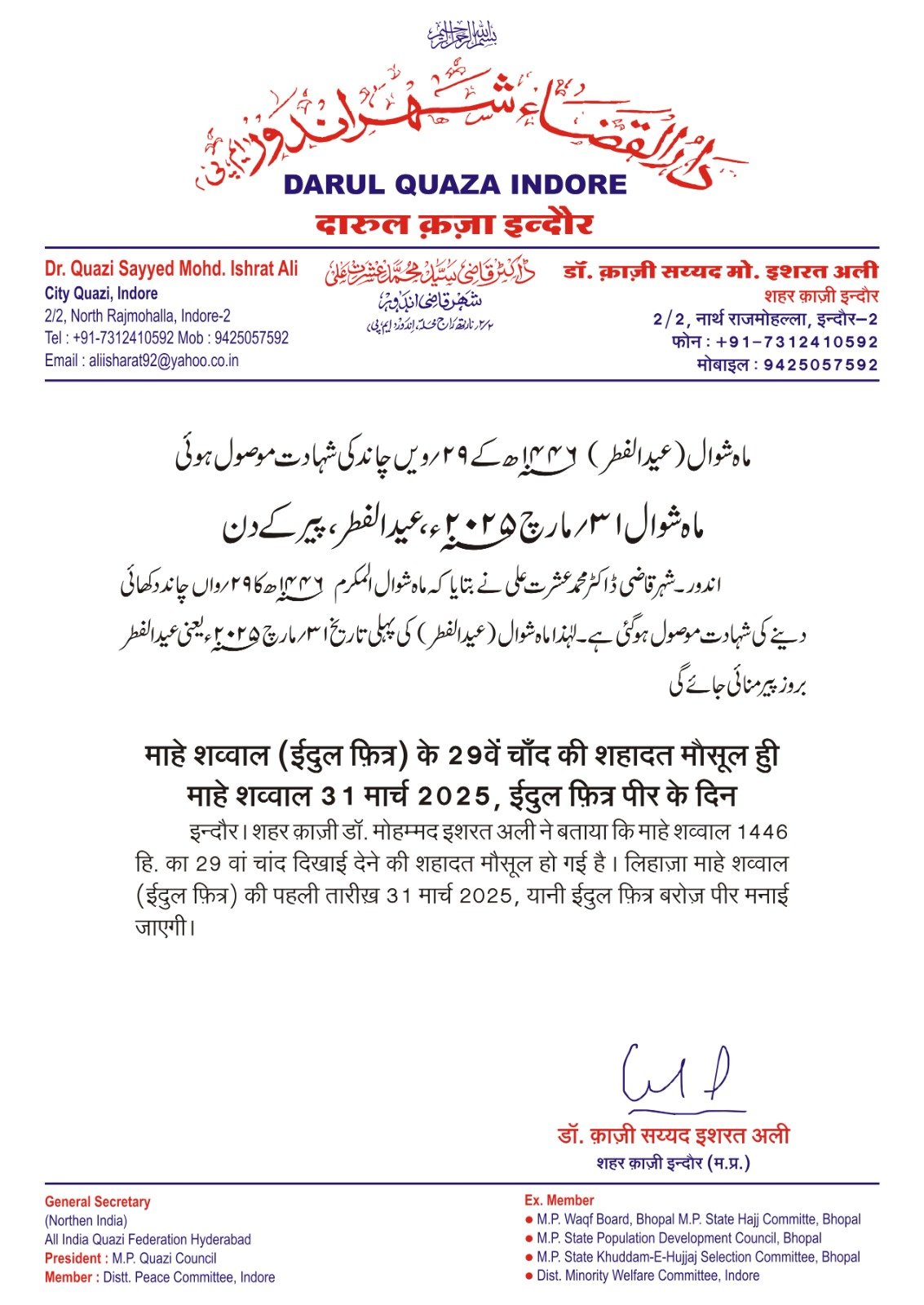 इंदौर। चांद दिखाने के साथ ही सोमवार को मुस्लिम समाज द्वारा ईद का पर्व मनाया जाएगा इंदौर शहर काजी इशरत अली ने बताया कि ईद का चांद दिख गया है और मुस्लिम समाज द्वारा हर्ष उल्लास के साथ कल ईद का त्यौहार मनाया जाएगा।