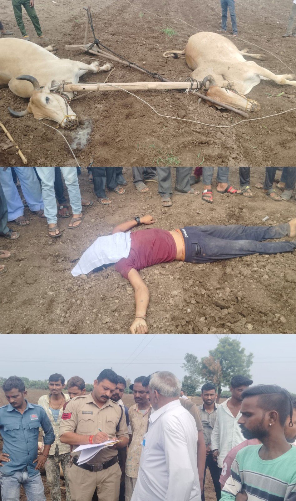 बुरहानपुर जिले के शाहपुर थाना क्षेत्र के ग्राम दापोरा चापोरा के बीच खेत मे हल चलाते समय अचानक बिजली के खंभे का तार टूटकर किसान और बेल जोड़ी पर गिरा जिससे किसान और दोनों बेलो की मौके पर ही मौत हो गई, घटना के बाद शाहपुर थाना पुलिस ने मौके पर पहुचकर पंचनामा बनाया मर्ग कायम कर शव को पीएम के लिए शाहपुर सामुदायिक स्वास्थ्य केंद्र रवाना किया।