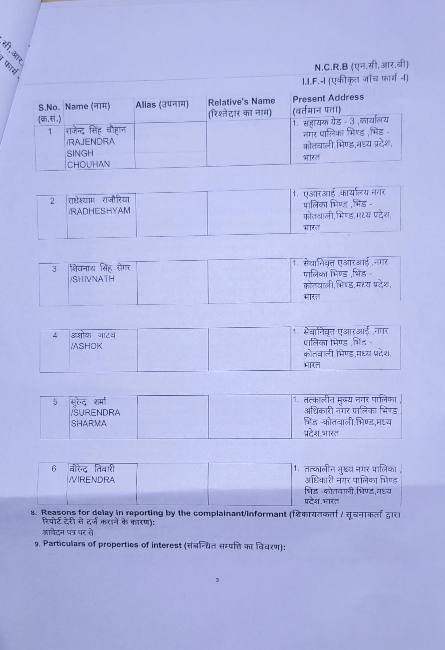भिंड नगर पालिका के वर्तमान CMO यशवंत वर्मा की शिकायत पर दर्ज की गई FIR, नपा के दो पूर्व CMO सहित 6 कर्मचारियों पर हुआ मामला दर्ज।उक्त मामले मे आरोपियों ने योजनाओं के लाभार्थियों के नाम पर कूट रचित बैंक खातों के जरिए सरकारी धनराशि का किया गबन।वास्तविक हितग्राहियों को नहीं किया भुगतान, अन्य अपने लोगों को धनराशि की हस्तांतरित।मामले की जांच कमेटी के प्रतिवेदन व जिला परियोजना समन्वयक और कलेक्टर की जांच मे इन वित्तीय अनियमितताओं की हुई पुष्टि।
