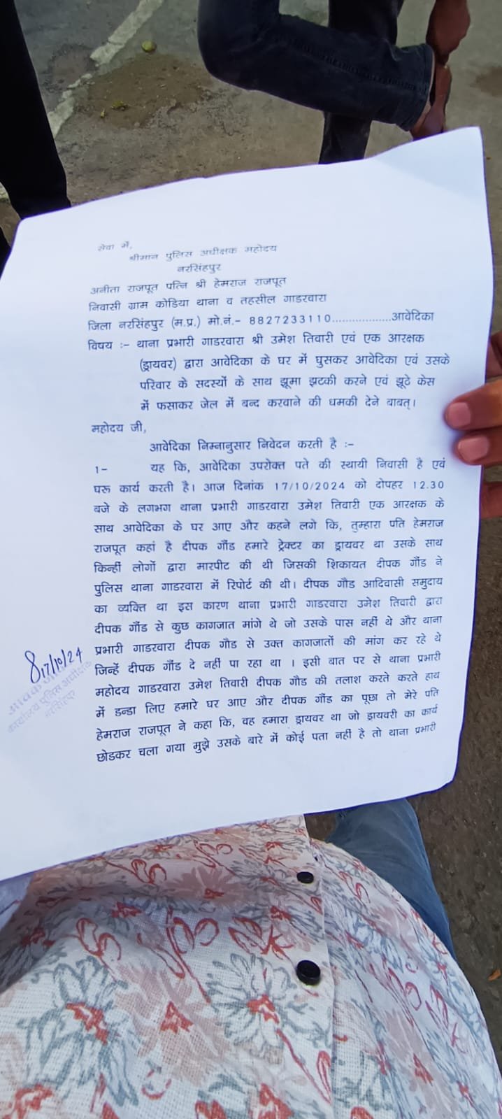 नरसिंहपुर जिले के गाडरवारा थाना प्रभारी व एक आरक्षक द्वारा बिना सर्च वारंट के एक ग्रामीण के घर में घुसकर परिवार के सदस्यों से झूमाझटकी करने और एक महिला को घायल करने का गंभीर मामला सामने आया है। गुरुवार दोपहर हुई इस घटना का वीडियो पीड़ित परिवार ने मोबाइल से रिकॉर्ड किया, जो अब सोशल मीडिया पर वायरल हो रहा है। घटना के बाद पीड़ित परिवार ने थाना प्रभारी उमेश तिवारी और आरक्षक के खिलाफ नरसिंहपुर पुलिस अधीक्षक को लिखित शिकायत सौंपी। इस दौरान मारपीट में घायल महिला अनीता का मेडिकल परीक्षण भी कराया गया ,,,,,क्या है पूरा मामला कौडिया गांव निवासी अनीता पति हेमराज राजपूत ने बताया कि गुरुवार दोपहर करीब साढ़े 12 बजे गाडरवारा थाना प्रभारी उमेश तिवारी और एक आरक्षक उनके घर पहुंचे और उनके पति हेमराज से ट्रैक्टर चालक दीपक गौंड के बारे में पूछताछ करने लगे।