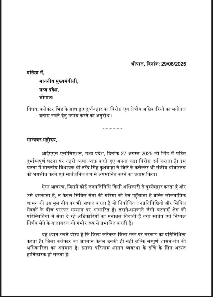 भोपाल: आईएएस एसोसिएशन, मध्य प्रदेश ने भिंड कलेक्टर श्री संजीव श्रीवास्तव के साथ हुए दुर्व्यवहार पर गहरा रोष व्यक्त किया है। एसोसिएशन ने मुख्यमंत्री को पत्र लिखकर विधायक श्री नरेंद्र सिंह कुशवाहा पर कलेक्टर को धमकाने और अपमानित करने का आरोप लगाया है।एसोसिएशन ने इस घटना को सिविल सेवा की गरिमा और लोकतांत्रिक व्यवस्था की नींव पर हमला बताया है। उनका कहना है कि इस तरह की घटनाएँ फील्ड में काम कर रहे अधिकारियों का मनोबल गिराती हैं और उन्हें स्वतंत्र व निष्पक्ष निर्णय लेने से रोकती हैं। पत्र में यह भी कहा गया है कि जिला कलेक्टर सरकार का प्रतिनिधित्व करता है, और उसका अपमान पूरे शासन-तंत्र का अपमान है।एसोसिएशन ने विधायक के इस व्यवहार की कड़ी निंदा करते हुए मुख्यमंत्री से तत्काल और सख्त कार्रवाई की मांग की है। उन्होंने तीन मुख्य अनुरोध किए हैं:
