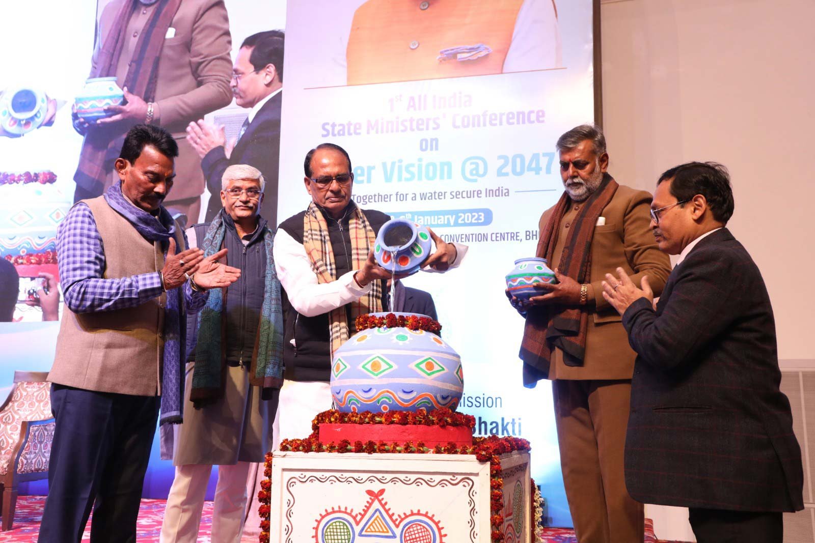 मुख्यमंत्री श्री शिवराज सिंह चौहान, केन्द्रीय जल शक्ति मंत्री श्री गजेन्द्र सिंह शेखावत और केन्द्रीय राज्य मंत्री श्री प्रहलाद पटेल ने जल संरक्षण और संचय के प्रतीक छोटे घड़ो से एक बड़े घड़े में जल भरकर 1st ऑल इंडिया स्टेट मिनिस्टर्स कॉन्फ्रेंस ऑन वॉटर विजन @ 2047 का शुभारंभ किया।