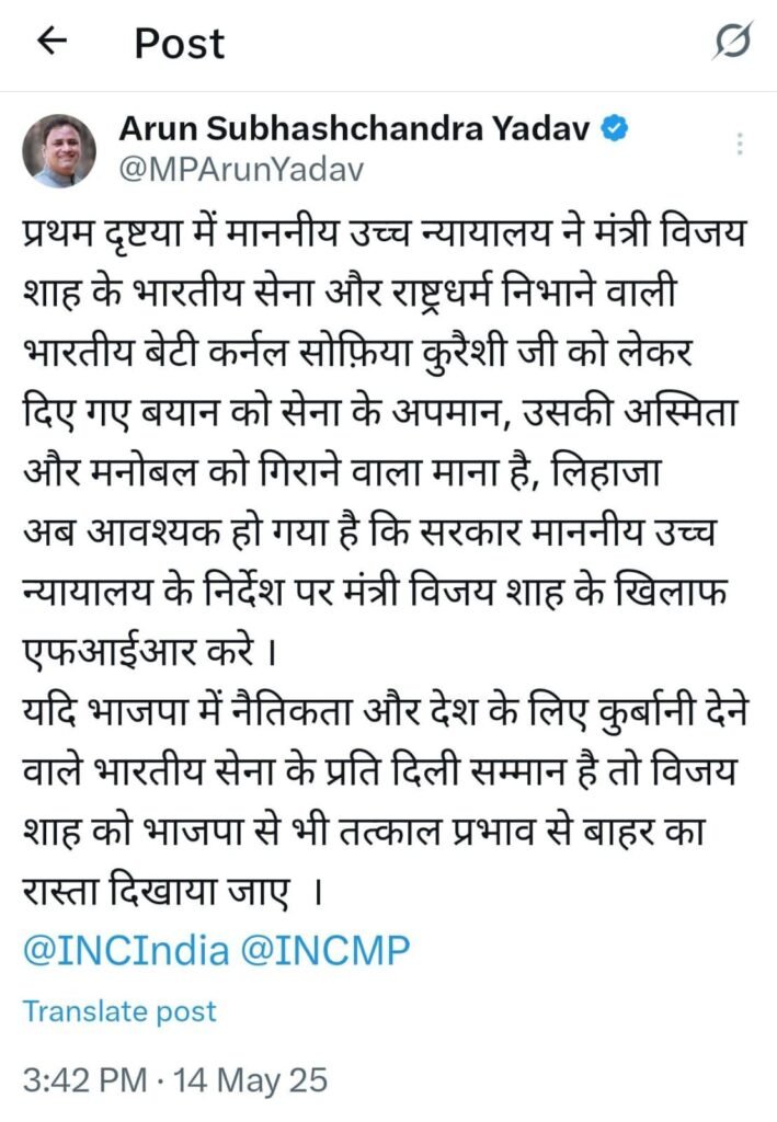 प्रथम दृष्टया में माननीय उच्च न्यायालय ने मंत्री विजय शाह के भारतीय सेना और राष्ट्रधर्म निभाने वाली भारतीय बेटी कर्नल सोफ़िया कुरैशी जी को लेकर दिए गए बयान को सेना के अपमान, उसकी अस्मिता और मनोबल को गिराने वाला माना है, लिहाजा अब आवश्यक हो गया है कि सरकार माननीय उच्च न्यायालय के निर्देश पर मंत्री विजय शाह के खिलाफ एफआईआर करे ।यदि भाजपा में नैतिकता और देश के लिए कुर्बानी देने वाले भारतीय सेना के प्रति दिली सम्मान है तो विजय शाह को भाजपा से भी तत्काल प्रभाव से बाहर का रास्ता दिखाया जाए ।