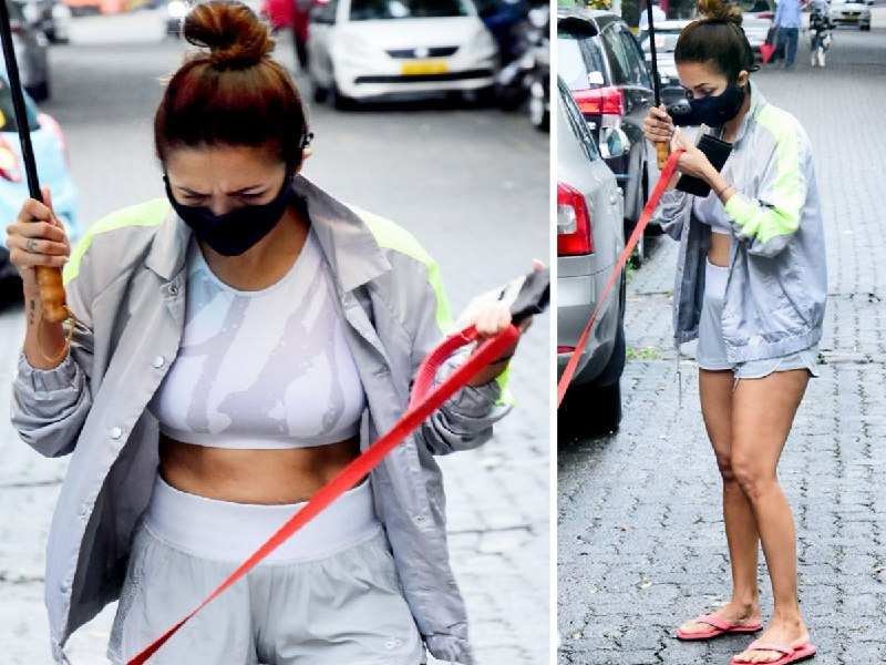 malaika arora shorts: lifestyle malaika arora in sports bra and shorts with her dog on morning walk