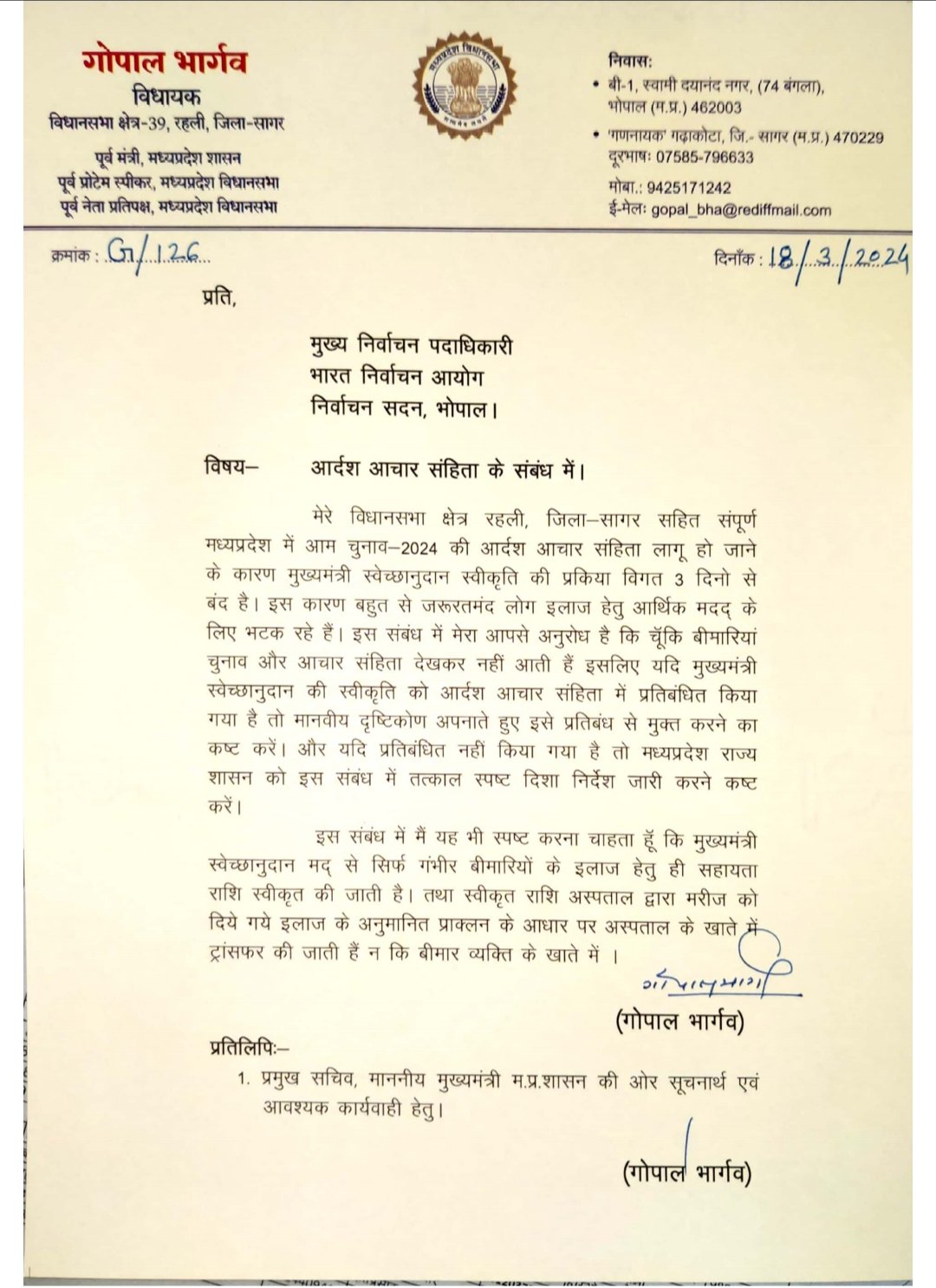 मध्य प्रदेश के सागर जिले के रहली विधानसभा से विधायक गोपाल भार्गव के द्वारा मुख्य निर्वाचन पदाधिकारी भारत निर्वाचन आयोग को पत्र लिखा गया है जिसमें उन्होंने कहा है कि मेरे विधानसभा क्षेत्र रहली, जिला सागर सहित संपूर्ण मध्यप्रदेश में आम चुनाव 2024 की आर्दश आचार संहिता लागू हो जाने के कारण मुख्यमंत्री स्वेच्छानुदान स्वीकृति की प्रकिया विगत 3 दिनो से बंद है। इस कारण बहुत से जरूरतमंद लोग इलाज हेतु आर्थिक मदद के लिए भटक रहे हैं। इस संबंध में मेरा आपसे अनुरोध है कि चूंकि बीमारियां चुनाव और आचार संहिता देखकर नहीं आती हैं इसलिए यदि मुख्यमंत्री स्वेच्छानुदान की स्वीकृति को आर्दश आचार संहिता में प्रतिबंधित किया गया है तो मानवीय दृष्टिकोण अपनाते हुए इसे प्रतिबंध से मुक्त करने का कष्ट करें। और यदि प्रतिबंधित नहीं किया गया है तो मध्यप्रदेश राज्य शासन को इस संबंध में तत्काल स्पष्ट दिशा निर्देश जारी करने कष्ट करें।
