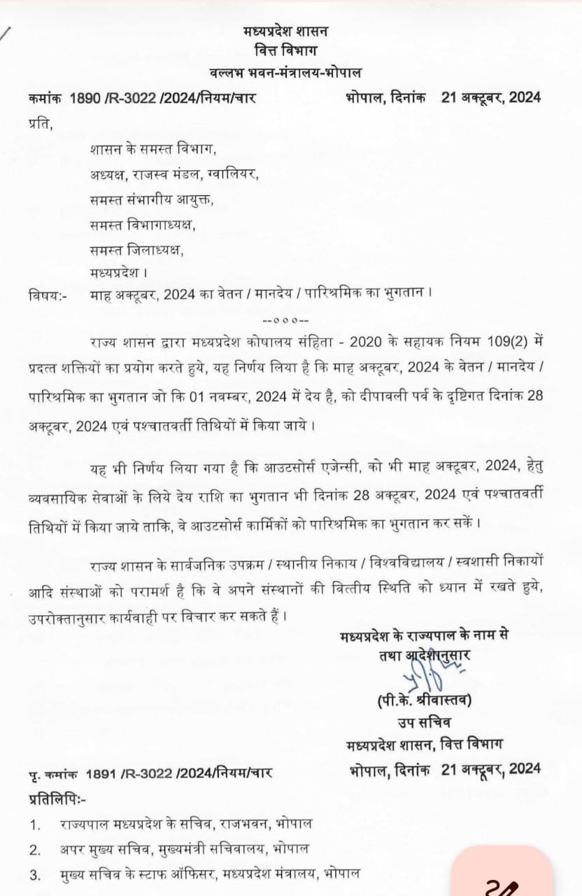 राज्य शासन द्वारा मध्यप्रदेश कोषालय संहिता 2020 के सहायक नियम 109(2) में प्रदत्त शक्तियों का प्रयोग करते हुये, यह निर्णय लिया है कि माह अक्टूबर, 2024 के वेतन / मानदेय / पारिश्रमिक का भुगतान जो कि 01 नवम्बर, 2024 में देय है, को दीपावली पर्व के दृष्टिगत दिनांक 28 अक्टूबर, 2024 एवं पश्चातवर्ती तिथियों में किया जाये।