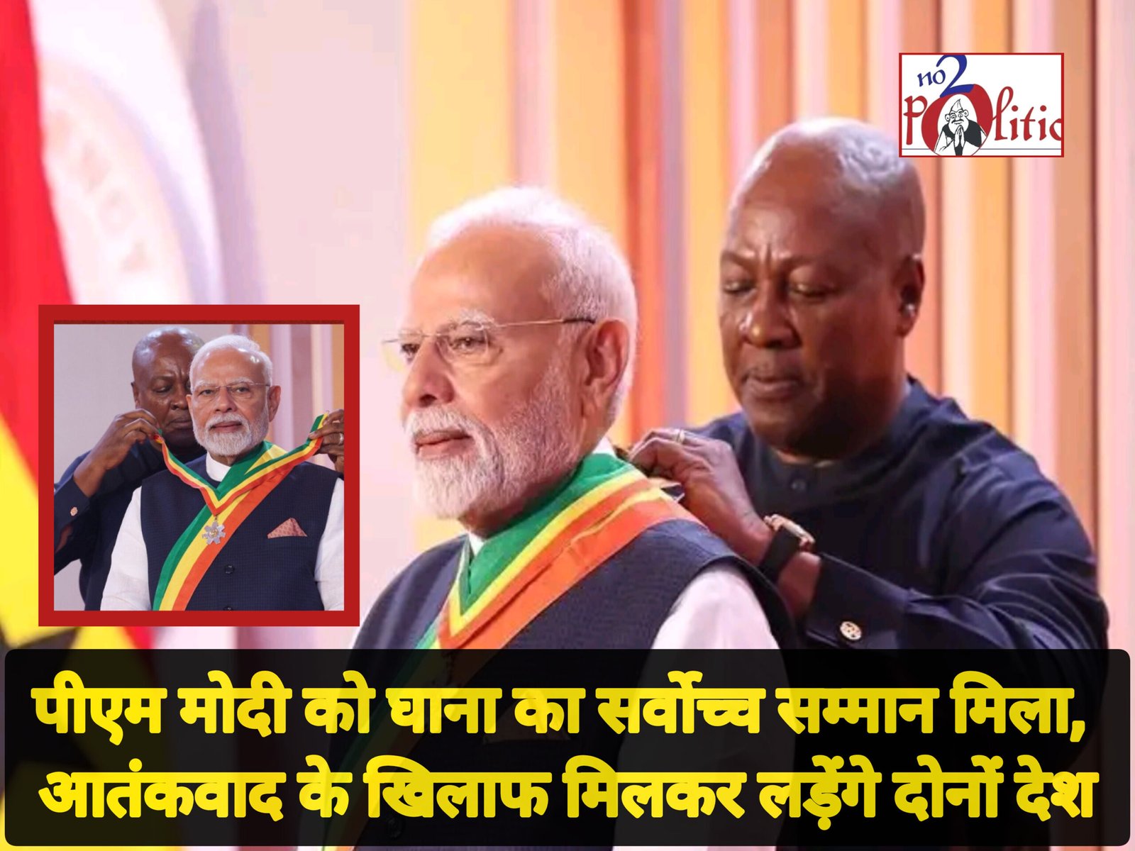 सम्मान समारोह के बाद, घाना के राष्ट्रपति जॉन महामा के साथ एक संयुक्त बयान में, पीएम मोदी ने आतंकवाद के मुद्दे पर दृढ़ता से बात की। उन्होंने कहा कि भारत और घाना दोनों आतंकवाद को मानवता का दुश्मन मानते हैं और इस वैश्विक खतरे से निपटने के लिए मिलकर काम करने के लिए प्रतिबद्ध हैं।