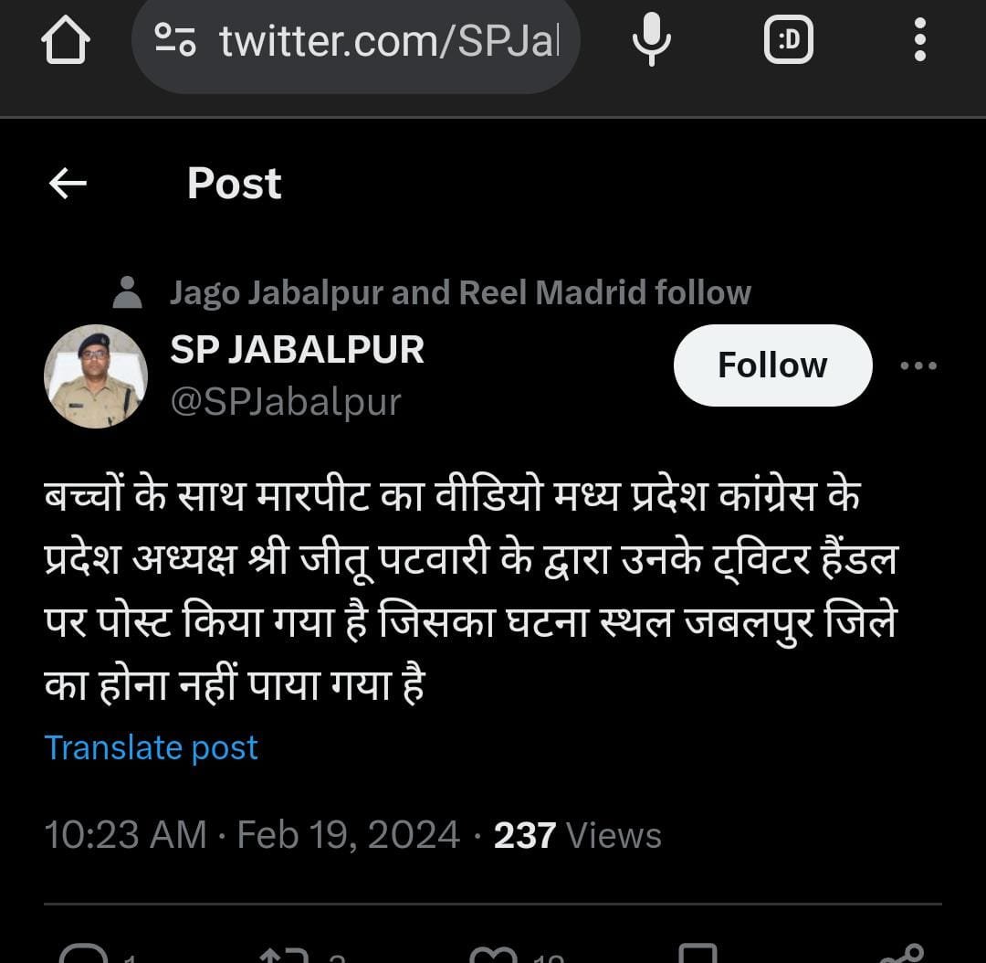 जानकारी के अनुसार प्रदेश कांग्रेस अध्यक्ष जीतू पटवारी के द्वारा सोशल मीडिया पर बच्चो की बेरहमी से मारपीट करने का वीडियो पोस्ट किया गया था जिस मामले को लेकर जबलपुर एएसपी का कहना है की वायरल वीडियो का जबलपुर से नहीं है कोई भी लेना देना और पिटाई का वीडियो जबलपुर का होना नहीं पाया गया है, वही जबलपुर पुलिस अधीक्षक ने सभी थाना प्रभारियों से वीडियो की के बारे में जानकारी जुटाई जा रही है,वीडियो वायरल करने के मामले में पोस्ट करने वालों पर हो सकती है कार्यवाही, सोशल मीडिया प्लेटफॉर्म X पर पोस्ट करने वालों की कुंडली खँगालेगी जबलपुर पुलिस और भ्रामक जानकारी फैलाने वालों पर हो सकती है आईटी एक्ट के तहत कार्यवाही।