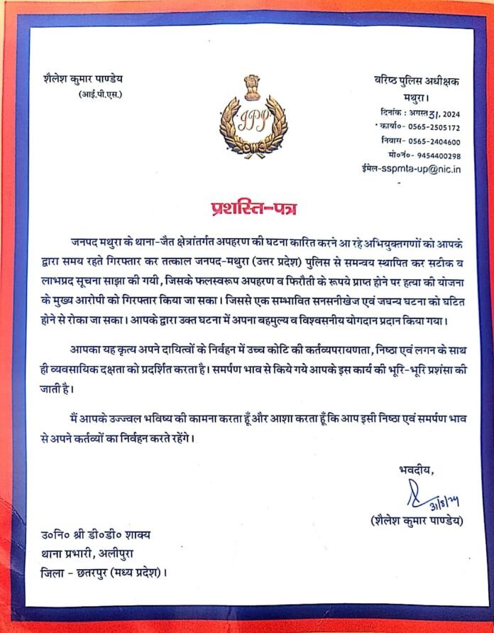 जिससे एक सम्भावित सनसनीखेज एवं जघन्य घटना को घटित होने से रोका जा सका।छतरपुर पुलिस द्वारा दायित्वों के निर्वहन में उच्च कोटि की कर्तव्यपरायणता, निष्ठा एवं लगन के साथ ही व्यवसायिक दक्षता में प्रदर्शन हेतु वरिष्ठ पुलिस अधीक्षक जिला मथुरा श्री शैलेश कुमार पांडे द्वारा एसडीओपी नौगांव श्री चंचलेश मरकाम, थाना प्रभारी अलीपुरा उप निरीक्षक डीडी शाक्य को प्रशस्ति पत्र देकर सम्मानित किया गया।पुलिस अधीक्षक छतरपुर श्री अगम जैन के द्वारा कार्यवाही में शामिल टीम को उचित इनाम देने की घोषणा की गई।