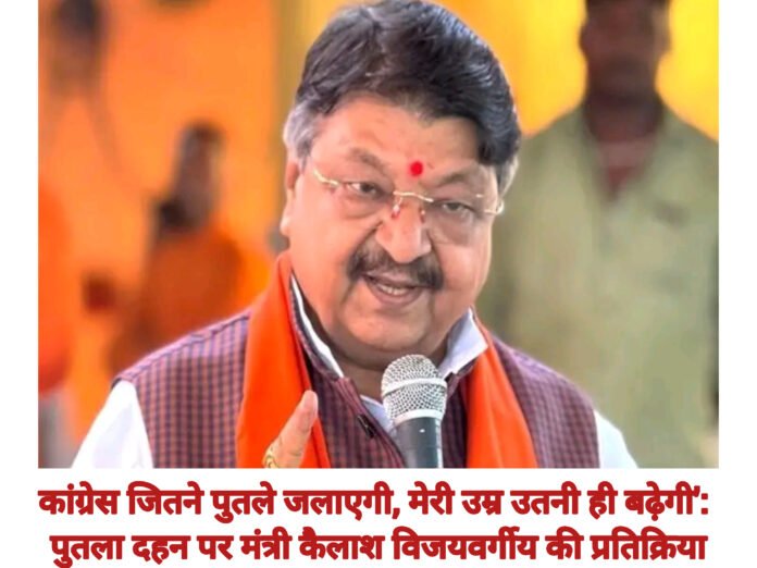 भोपाल, मध्य प्रदेश।नगरीय प्रशासन मंत्री कैलाश विजयवर्गीय ने मध्य प्रदेश में कांग्रेस कार्यकर्ताओं द्वारा उनके पुतले जलाने पर तीखी प्रतिक्रिया दी है। यह पुतला दहन कांग्रेस नेताओं राहुल गांधी और प्रियंका गांधी पर विजयवर्गीय द्वारा की गई कथित विवादित टिप्पणी के विरोध में किया गया था।