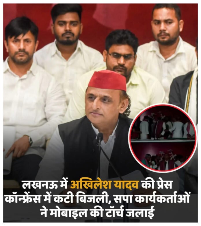 अखिलेश यादव की प्रेस कॉन्फ्रेंस में गुल हुई बिजली, कार्यकर्ताओं ने मोबाइल की फ्लैशलाइट जलाकर संभाला