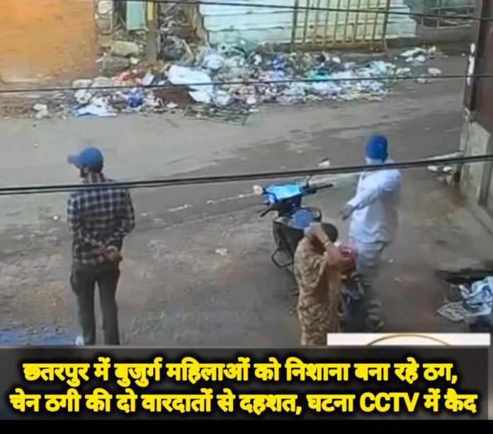 छतरपुर, मध्य प्रदेश:छतरपुर शहर में बुजुर्ग महिलाओं को निशाना बनाकर ठगी और चोरी की घटनाएं सामने आई हैं, जिससे शहर में दहशत का माहौल बन गया है। 5 अप्रैल को कोतवाली और सिविल लाइन थाना क्षेत्रों में दो अलग-अलग घटनाओं में आरोपियों ने एक ही तरीके से महिलाओं को झांसे में लेकर उनके सोने के गहने गायब कर दिए।जानकारी के मुताबिक, कोतवाली थाने के ठीक बगल में हुई घटना का वीडियो भी सामने आया है, जिसमें दो युवक एक बुजुर्ग महिला को बातों में उलझाकर उसके गहने उतरवाते नजर आ रहे हैं।