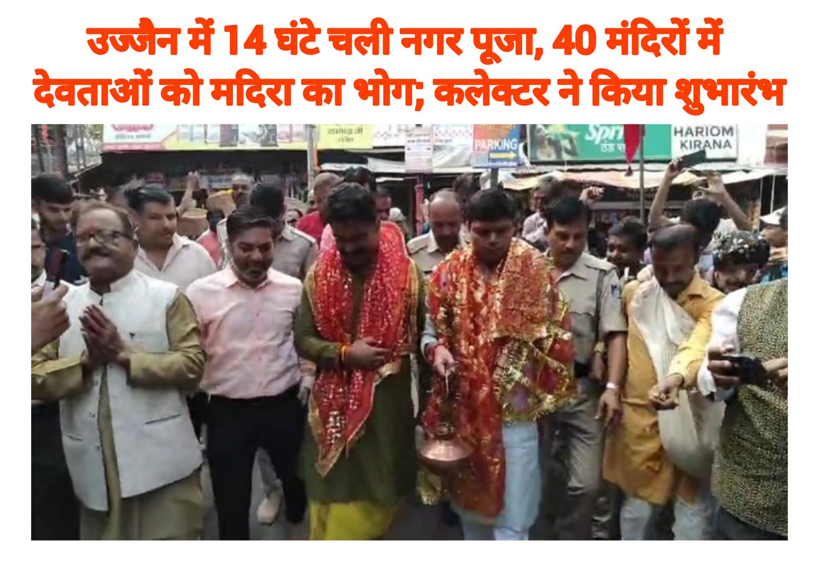 इसके बाद, शासकीय अधिकारी और कोटवारों का दल ढोल-ढमाकों के साथ शहर के विभिन्न स्थानों में स्थित 40 से अधिक देवी और भैरव मंदिरों के लिए रवाना हुआ। यह दल नगर के करीब 27 किलोमीटर लंबे पूजा मार्ग पर मदिरा की धार लगाते हुए चलता है। भोग में मदिरा के साथ पूड़ी, भजिए, गेहूं व चने की घुघरी भी अर्पित की जाती है।सम्राट विक्रमादित्य के काल से चली आ रही है परंपरामान्यता है कि उज्जैन में नगर पूजा की यह परंपरा सम्राट विक्रमादित्य के काल से चली आ रही है। प्राचीन काल में राजा-महाराजा इस परंपरा का निर्वहन करते थे, और स्वतंत्रता प्राप्ति के बाद इसे सरकार की ओर से कराया जाता है।