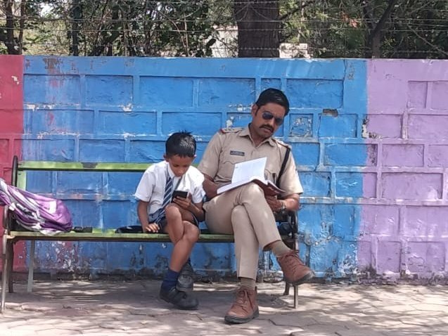 एक ऐसी ही तस्वीर मध्य प्रदेश की राजधानी भोपाल से आई है। एक पुलिस अधिकारी अपने बेटे को पढ़ाते हुए दिखाई दे रहा है। पुलिस अधिकारी का नाम देव नारायण पांडेय है और वे भोपाल ट्रैफिक पुलिस में सूबेदार के पद पर कार्यरत हैं।