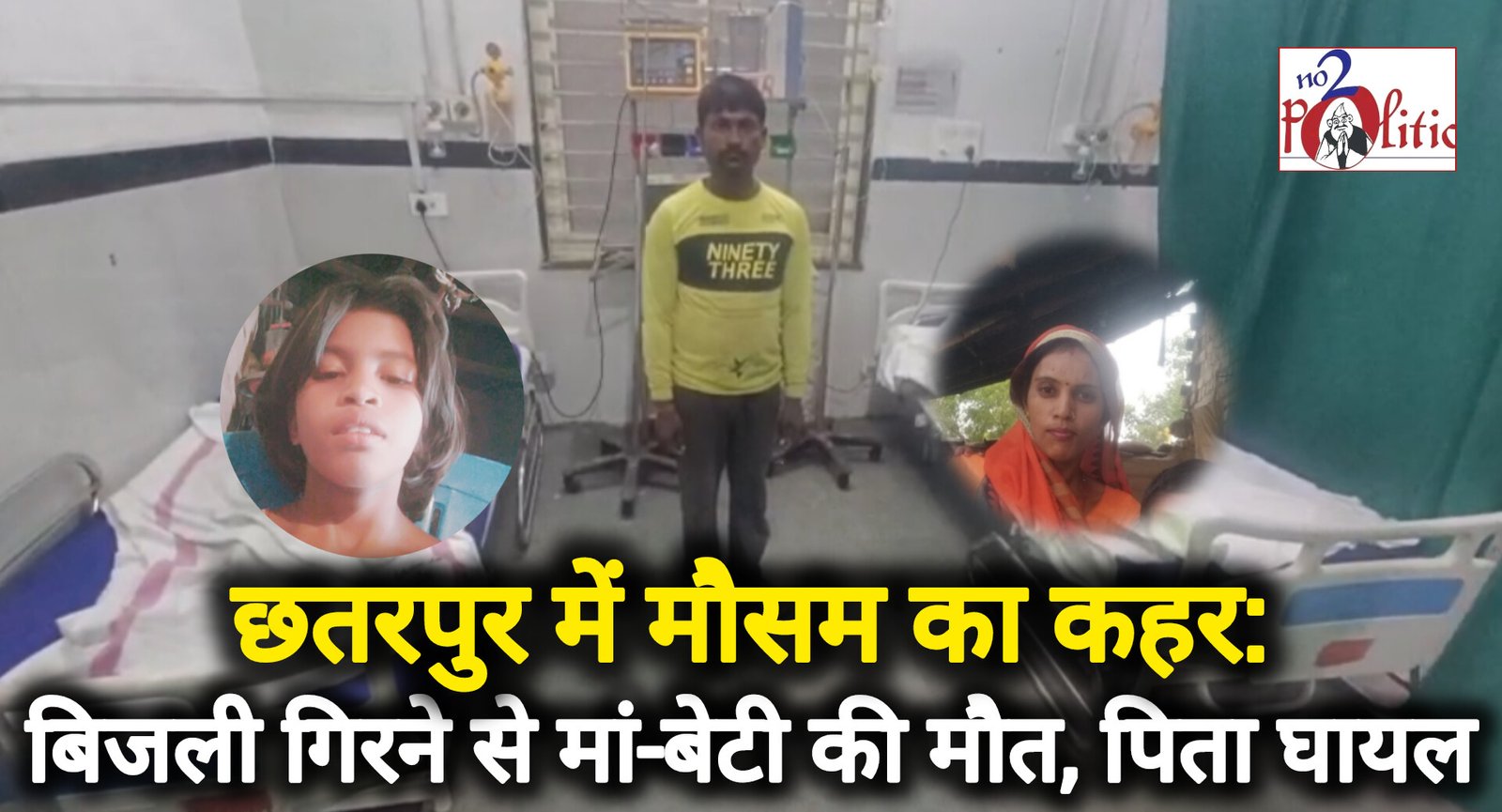छतरपुर, मध्य प्रदेश: बुंदेलखंड के छतरपुर जिले में शुक्रवार (आज) शाम अचानक मौसम ने करवट ली. तेज हवा, बारिश और बिजली गिरने से दो अलग-अलग हादसों में एक मां-बेटी की मौत हो गई, जबकि एक व्यक्ति घायल हो गया.पहला हादसा गढ़ीमलहरा थाना क्षेत्र के खीरी गांव में हुआ. शाम करीब 5:30 बजे, मानकुंवर (36) और उनकी बेटी करिश्मा (11) अपने पति/पिता मनप्यारे कुशवाहा (37) के साथ खेत में सफाई कर रहे थे. अचानक बारिश शुरू होने पर तीनों एक नीम के पेड़ के नीचे खड़े हो गए, तभी उन पर आकाशीय बिजली गिरी. इस दर्दनाक हादसे में मानकुंवर और करिश्मा की मौके पर ही मौत हो गई. घायल मनप्यारे कुशवाहा को जिला अस्पताल में भर्ती कराया गया है